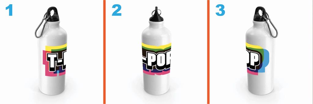 - Si vous choisissez la 2ème vignette indiquant « Gourde/Bouteille en aluminium - Impression circulaire », votre visuel sera imprimé sur le tour (presque) complet de la gourde.