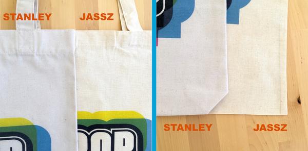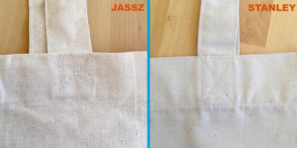 Pour avoir eu en mains les tote bags de Jassz et Stanley, nous pouvons vous assurer que ce ne sont pas du tout les mêmes produits. De taille pratiquement similaire, ils se différencient par l’épaisseur (140 g/m2 VS 300 g/m2), la couleur et les coutures.