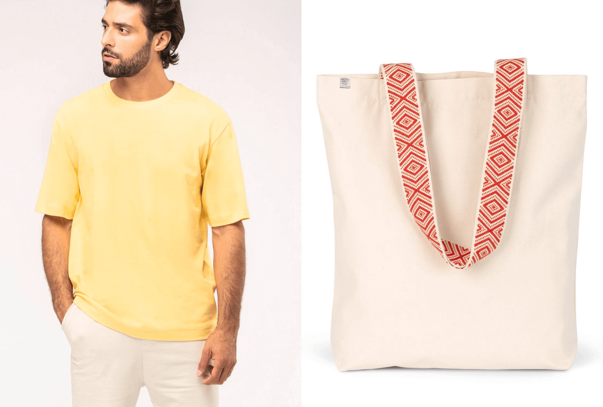 Thus, you will find in the catalogue original, natural and vivid shades, directly inspired by the unadorned landscapes that we, at TPOP, love so much. For example, we fell in love with the fruity colour of the oversized T-shirt for men that we offer, reminiscent of the shade of a freshly cut pineapple. The brand's style is also expressed in delicate fancy finishes such as the handles of the Ethnic Shopping tote bag, also available in our catalogue.