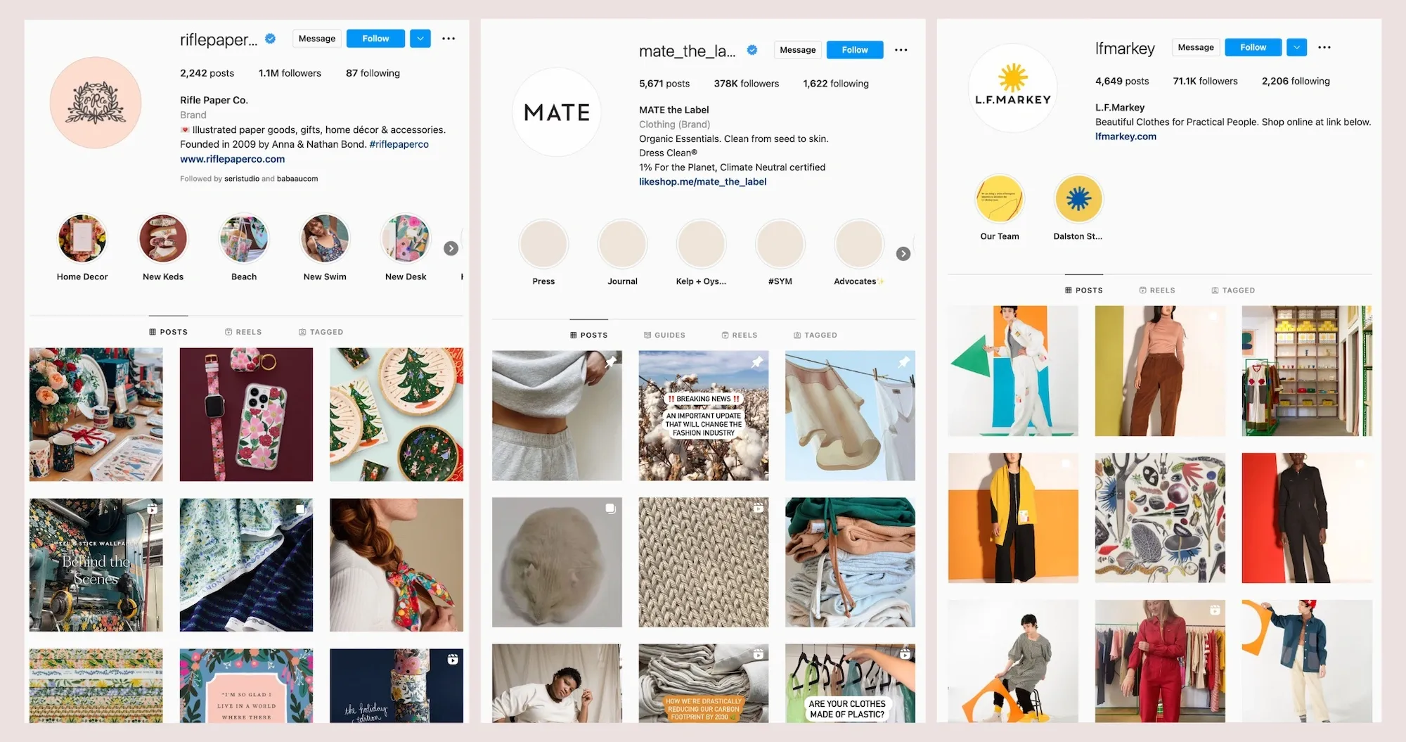 Järkyttääkö se sinua? Silti se on vähän kuin laiminlyöty sosiaalinen profiili, jota meillä on taipumus nähdä hiukset liian usein. Se on sääli, koska johdonmukainen ja esteettinen sisältö on loistava myyntivaltti: se todistaa paitsi että olet mielenkiintoinen, myös luotettava (tunnet tuotteesi ja osaat lavastaa ne). Tämä kohta ei voisi olla totta sosiaalisen kaupankäynnin yhteydessä, koska brändisi löydetään verkostoista... Laita ne täyteen siisteillä valokuvauksilla, paletilla, joka on rajoitettu 3 väriin ja toistuviin brändifontteihin (enintään kaksi). Koska pieni inspiraatio ei ole koskaan vahingoittanut ketään, annamme sinun miettiä joitain esimerkkejä siisteistä sosiaalisen kaupankäynnin esittelyistä ... Ensin Instagramissa: