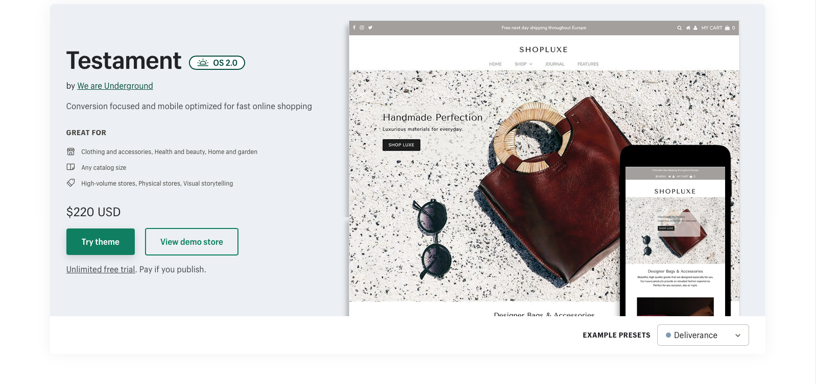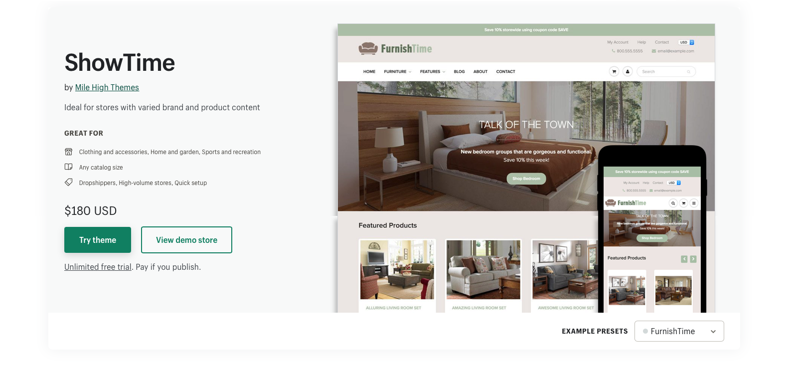 Het Showtime-thema is ideaal voor winkels met veel producten of die meerdere merken voeren. U kunt kiezen uit drie headerstijlen en vele aanpassingsmogelijkheden. Net als bij Testament kunnen gebruikers snel van het ene naar het andere product navigeren en het gemakkelijk aan hun winkelwagen toevoegen. De klant zal ook in staat zijn om gemakkelijk items te sorteren met een uitgebreide filtering optie.