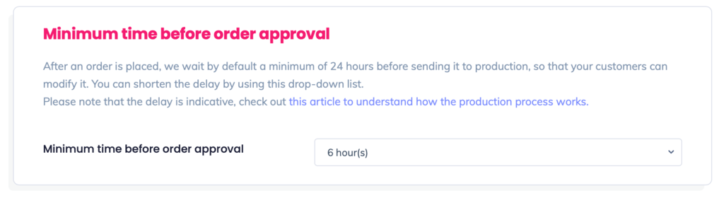 Par défaut, lorsqu'une commande est passée sur une de vos boutiques (Etsy, Shopify ou WooCommerce), nous attendons au minimum 24 heures avant de traiter et valider celle-ci.