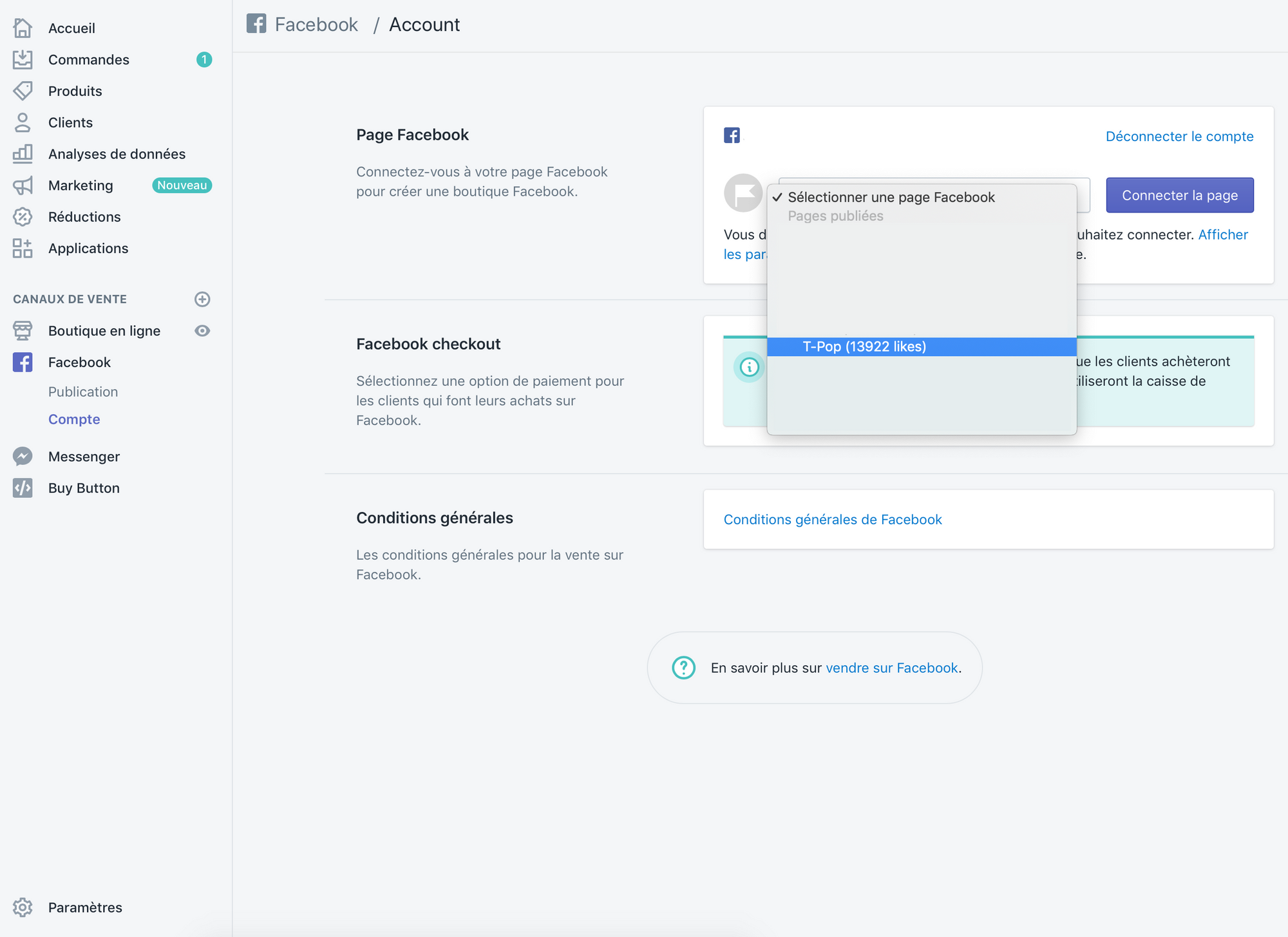 Jos haluat nyt valita tuotteet, jotka haluat myydä Facebookin kautta, siirry tuotelistaukseen ja valitse sitten "Myyntikanavat" -ruudussa "Hallitse". Valitse asianmukaiset ruudut ja voilà, muutamassa minuutissa tuotteesi lisätään automaattisesti sivullesi Facebook-sivusi "Kauppa" -välilehdellä.